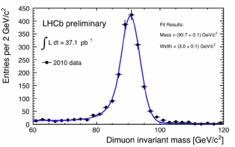 Na figura acima, vemos a distribuição de massa das filhas, que nominamos como “massa invariante”: um múon negativo e um múon positivo, provenientes da desintegração de uma partícula Z0. A massa dessa ressonância é de 90.7 GeV, a sua largura, ou incerteza é de 3.0 GeV. A função em azul, que descreve a distribuição destes eventos, é o quadrado da função complexa, que descreve as ressonâncias, conhecida como Breit-Wigner: