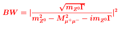 Onde Mz0  é a massa da ressonância, m^2_{\mu+\mu-} é o resultado do cálculo da massa invariante das duas filhas, gama é a largura da ressonância ou incerteza na massa, que aparecem multiplicados pelo número imaginário i. Como estamos representando valores reais obtidos nos detectores de partículas, esta função deve ser elevada ao quadrado, para torná-la real.