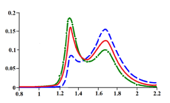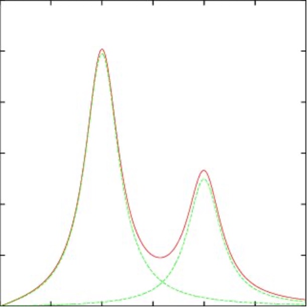 Duas ressonâncias clássicas ocupando parcialmente a mesma região da massa invariante. https://arxiv.org/pdf/1206.0865.pdf