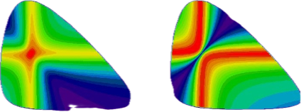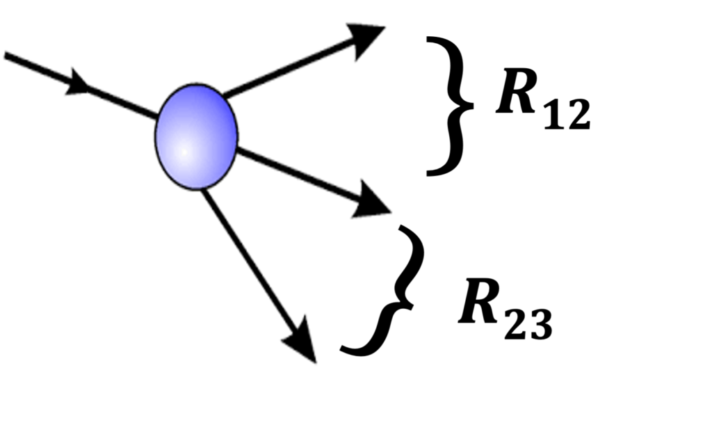 Para o sistema das partículas 1 e 2, podemos encontrar ressonâncias que chamamos de R12, já se juntamos as partículas 2 e 3, teremos a possibilidade de encontrar ressonâncias do tipo R23. Ë possível que em determinadas regiões de energia, a partícula 2 pode estar tanto na ressonância R12, como na R23. Classicamente isto seria impossível, mas no mundo quântico isso é viável e mais que isso, as ressonâncias R12 e R23, podem interferir, tanto de uma forma construtiva como de uma forma destrutiva. Se as duas forem igualmente prováveis nesta região de energia, elas podem aparecer como quatro vezes mais intensa que nas suas vizinhanças, ou mesmo podem se anular e aparecerem com intensidade zero nesta mesma região. Como mostra estas simulações mostrada nas figuras abaixo. Elas representam duas ressonâncias que se encontram de uma forma perpendicular, vermelho representa forte intensidade, azul pouca. Na figura da esquerda temos interferência construtiva, onde as duas se encontram de forma construtiva e intensidade se multiplica por 4, em relação aos outros pontos fora da região de interferência. Já a figura da direita apresenta uma interferência destrutiva, onde a região do encontro delas, fica anulado, com intensidade zero.