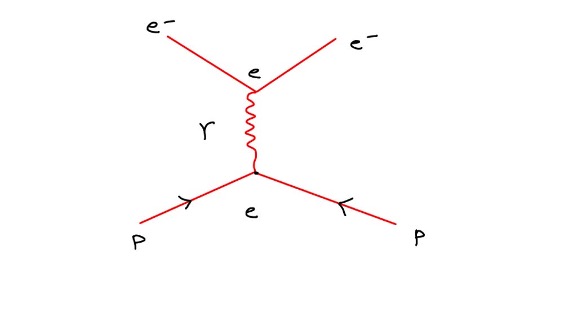 Claro está, que isso é uma representação possível em um mundo virtual onde vive a mecânica quântica. No mundo real, das observações, não existe massa negativa. A “bola” quântica é representada por uma função com números complexos, com características peculiares para cada tipo de interação. Para as interações eletromagnéticas, a bola é representada pelo quantum de luz, que é o fóton. Nas interações entre quarks, a “bola” é um glúon, nas interações fracas temos dois tipos de “bola”, o bóson W e o Z. Uma forma muito usada de representar este processo foi proposto por Feynman, como mostrado na figura abaixo.